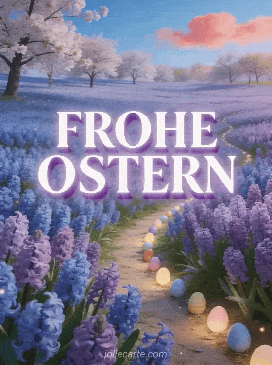 Entdecke diese fröhlichen kostenlosen Osterbilder mit einer Frühlingslandschaft und Hyazinthen. Entdecke auch schöne Osterkarten kostenlos oder Oster GIF kostenlos.