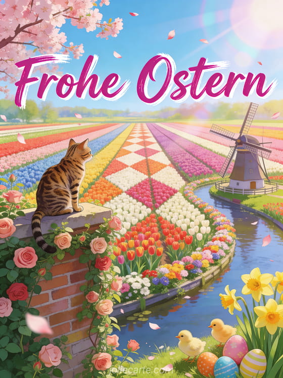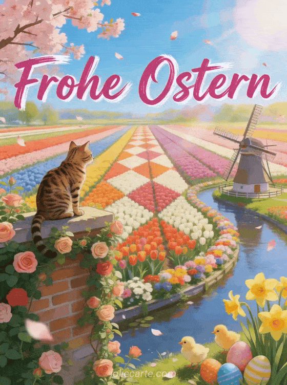 Feiern Sie Ostern mit dieser bezaubernden kostenlosen animierten Grußkarte mit eine Bengal-Katze auf einer rosenbedeckten Gartenmauer mit Blick auf die Tulpenfelder von Keukenhof mit Osterküken und dekorierten Eiern unter Kirschblüten. Entdecken Sie auch cartes de pâques gratuites pour facebook cartes pour paques.