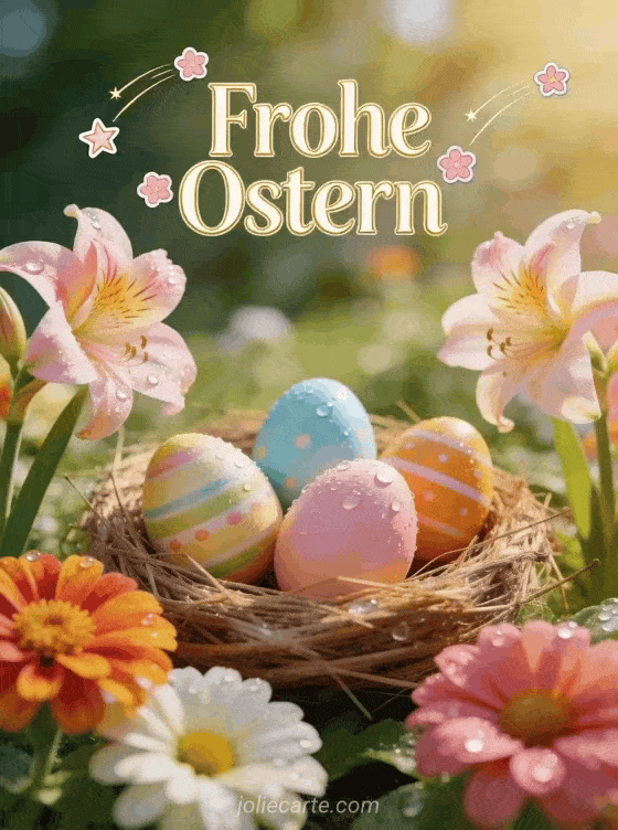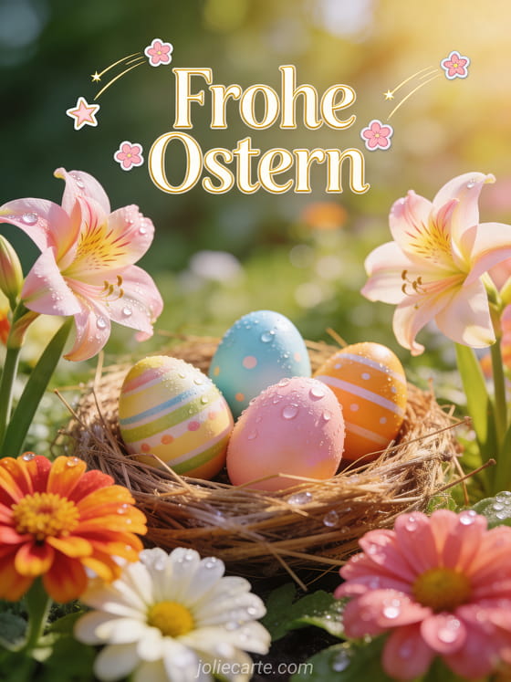 Senden Sie diese kostenlosen Osterkarten mit einer fotorealistischen Fruehlingsszene mit einem Nest aus wunderschoen bemalten Ostereiern zwischen Zinnien und Amaryllis, Tautropfen auf den Bluetenblaettern, warmem Morgenlicht und sanftem Bokeh-Hintergrund. Entdecken Sie auch eine Ostergrusskarte, eine Karte frohe Osterfeiertage oder eine Osterkarte gratis.