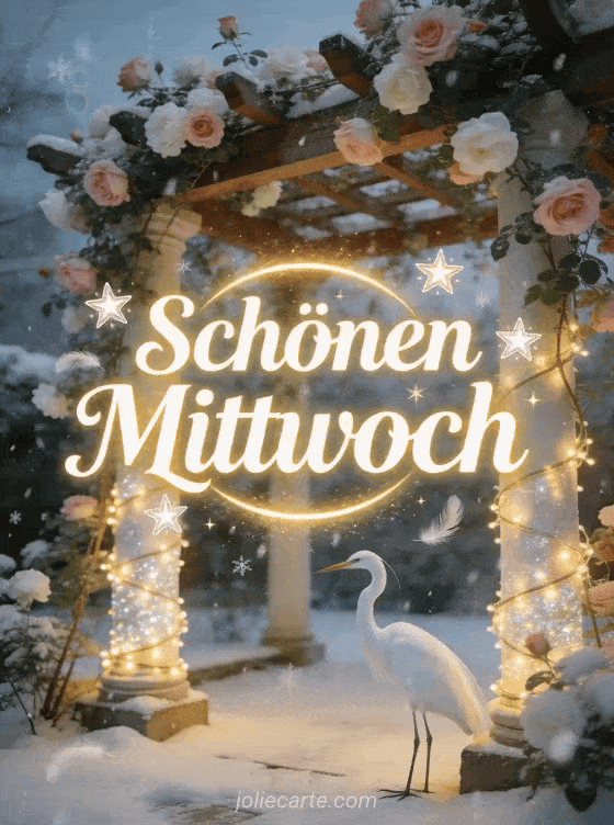 Teile einen magischen Schönen Mittwoch Gruß mit einer blühenden Pergola, einem majestätischen Silberreiher und funkelnden Winterlichtern. Entdecke auch gif bilder schönen mittwoch, schönen mittwoch botschaft und bild guten mittwochabend.