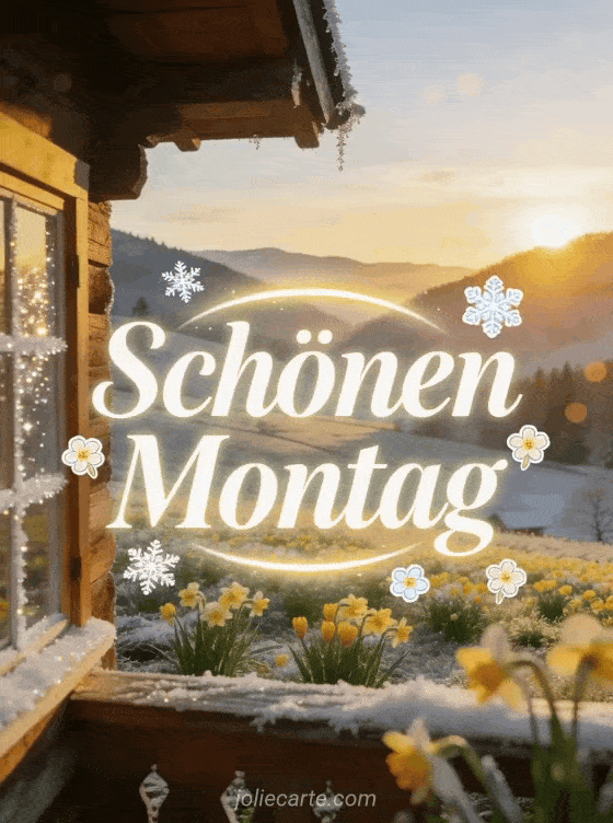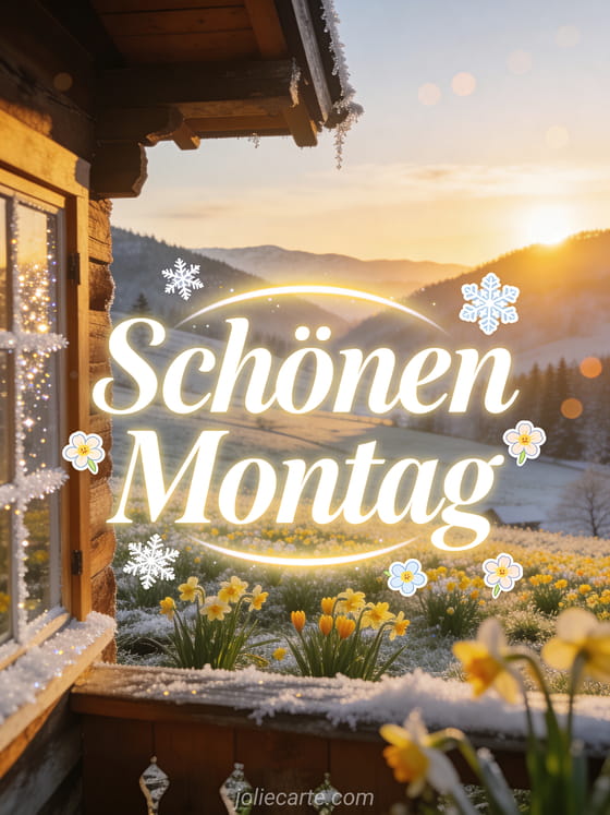 Sende kostenlose Schönen-Montag-Karten mit eleganten weißen Buchstaben, Schneeflocken, kleinen Gänseblümchen und einem blühenden Tal im goldenen Sonnenaufgang. Teile einen frischen Wunsch zum Wochenstart und entdecke auch schönen Montag und gute Woche Bild, schönen Montag Küsschen GIF oder schöne Guten Morgen Montag Bilder.