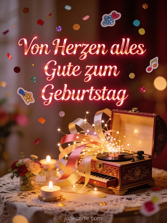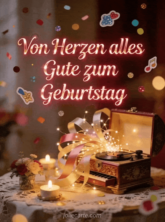 Sende einen Herzenswunsch zum Geburtstag mit leuchtender rubinroter Schrift, buntem Konfetti, einer verzierten offenen Spieluhr, herabfallenden Schleifen, kleinen Kerzen und warmem funkelndem Licht. Entdecke auch eine Karte für geburtstag frau natur, eine geburtstagskarte frau blumenstrauß oder ein kostenloses lustiges frau geburtstag gif.