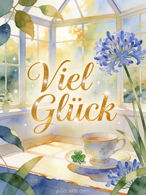 Sende viel Glück mit goldener Schrift, einer Porzellantasse, einem kleinen grünen Glücksbringer und blauen Agapanthusblüten in einer sonnigen Veranda. Entdecke auch Viel Glück Karte, Viel Glück bei deiner Prüfung Text oder kostenlose animierte GIFs viel Glück.