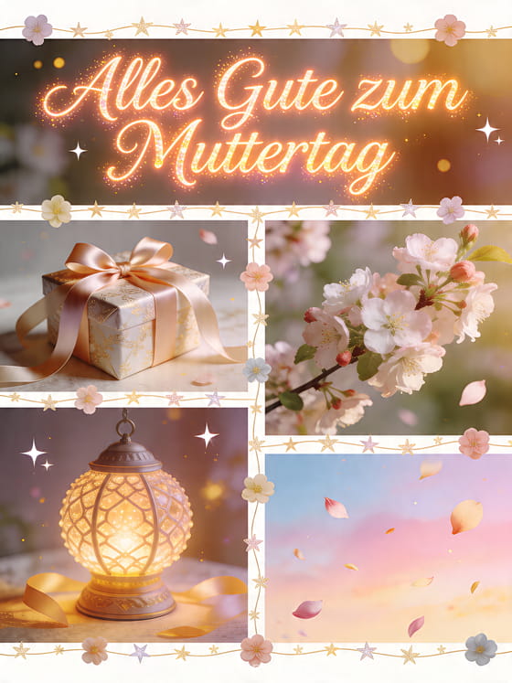 Teile kostenlose virtuelle Muttertagskarten mit einer vierteiligen illustrierten Collage: Geschenk mit Satinbändern, Frühlingsblüten, dekorative Lampe, pastellfarbener Himmel und schwebende Blütenblätter. Entdecke auch einen Spruch zum Muttertag, Alles Gute zum Muttertag für meine Tante oder Text über Muttertag.