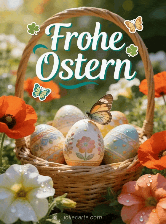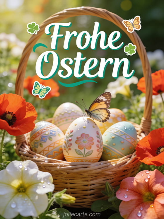 Senden Sie diese kostenlose virtuelle Osterkarte mit einem schoenen Foto eines Korbs mit kunstvoll bemalten Ostereiern zwischen Mohnblumen und Petunien, Morgentau auf den Bluetenblaettern und einem Schmetterling der sich auf ein Ei setzt. Profiqualitaet. Entdecken Sie auch eine Osternachricht, ein kostenloses Osterbild oder eine Osterkarte fuer Facebook.