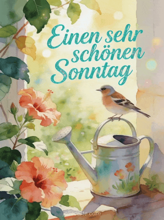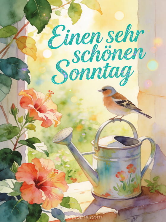 Teile einen sonnigen Sonntagsgruß mit einem Aquarellgarten, Hibiskusblüten und einem Hänfling auf einer bemalten Gießkanne. Entdecke auch ein Schönen Sonntag Sonne GIF, ein Schönen Sonntag mit Kaffee Bild oder ein Schönen Sonntag Katze GIF.