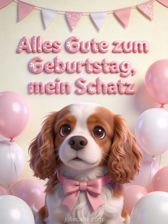 Sende einen süßen Geburtstagsgruß für deine Enkelin mit einem Cavalier King Charles Hund mit zartem Blick, rosa Schleife am Hals, rosa-weißen Pastellballons und einer Wimpelgirlande. Entdecke auch Geburtstag meiner Enkelin oder Geburtstagskarte für meine Enkelin.