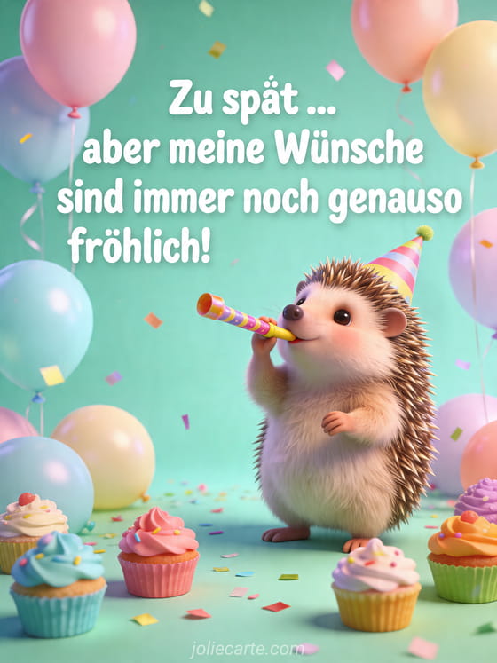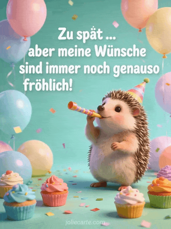 Teile mit dieser süßen Karte mit Igel, Partyhut, Ballons, Konfetti und bunten Cupcakes eine festliche nachträgliche Geburtstagsbotschaft. Entdecke auch nachträglich alles gute zum geburtstag bilder, nachträglich alles gute zum geburtstag oder nachträgliche geburtstagskarte.