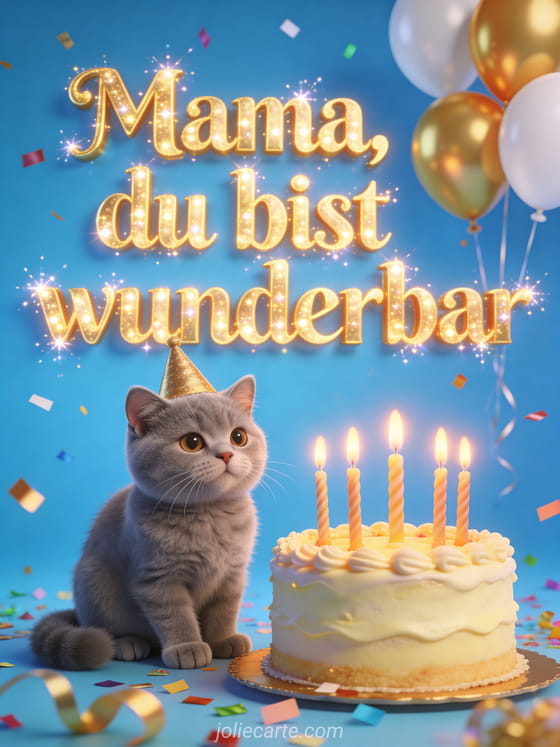 Sag Mama, dass sie wunderbar ist, mit einer fröhlichen Geburtstagskarte mit grauer British Shorthair Katze, leuchtendem Kuchen, goldenen Ballons und festlichem Konfetti. Du kannst auch eine Alles Gute zum Geburtstag Karte für Mama, eine Karte mit Alles Gute zum Geburtstag Mama Herz oder eine Geburtstagskarte für die eigene Mama senden.
