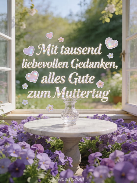 Teile ein kurzes Gedicht zum Muttertag auf einer eleganten realistischen Karte mit pastellfarbenen Herzen, kleinen Blüten, Veilchen, einer Kristallvase, Marmortisch und offenem Gartenfenster. Entdecke auch Muttertagsfotos, schönen Sonntag alles Gute zum Muttertag oder freie Muttertagsbilder.
