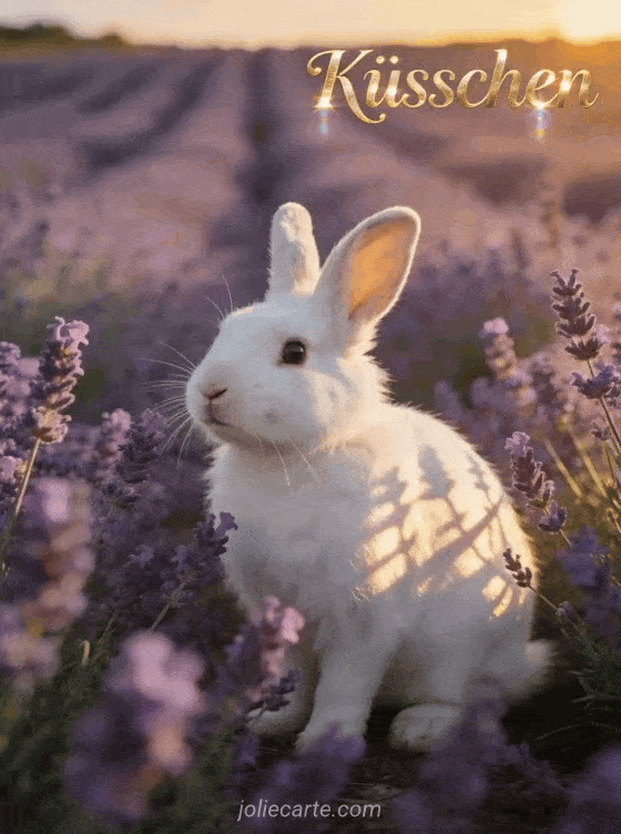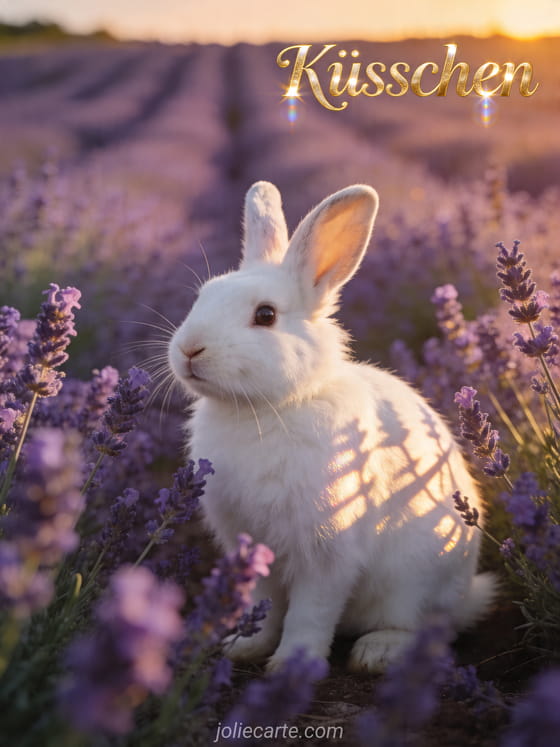 Teilen Sie eine liebevolle Küsschen-Botschaft mit dieser sanften Karte, die einen flauschigen weißen Hasen in einem Lavendelfeld bei Sonnenuntergang zeigt. Entdecken Sie auch küsschen gif, animierte küsschen logos oder küsse aus der ferne.