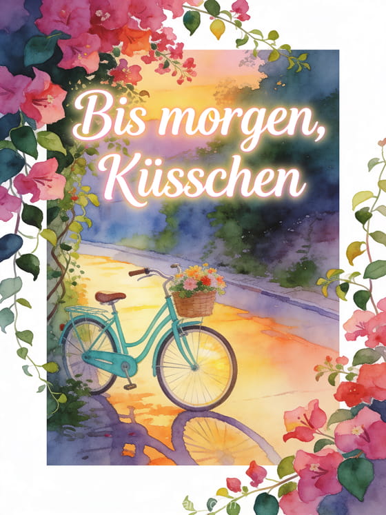Teile einen hellen Abendabschied mit luftiger Aquarellschrift, Bougainvillea über dem Rand und einem türkisfarbenen Fahrrad mit Blumenkorb an einer sonnigen Gasse. Entdecke auch eine Küsschen bis morgen GIFs, eine Bilder bis morgen Küsse oder eine halt durch bis morgen Karte.