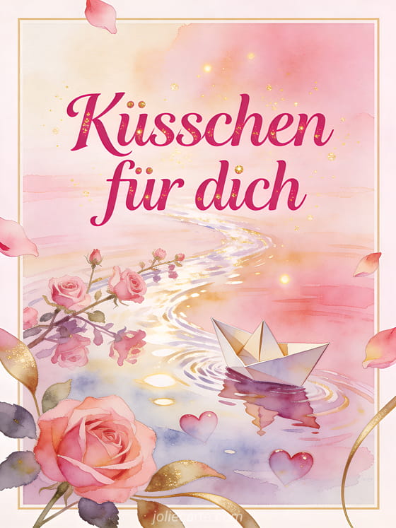 Sende Küsschen für dich mit einer feinen Aquarellkarte, die ein gefaltetes Papierboot auf einem sanften Fluss, rosafarbene Rosen und Herzreflexe zeigt. Teile noch mehr Nähe mit einem Affe Küsse GIF, einem Küsse senden Bild oder einem Murmeltier Küsse gif.