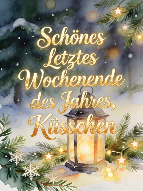 Sende Küsschen letztes Wochenende des Jahres mit eleganter Aquarellschrift, einer warmen Wintergartenlaterne, Tannenbaumzweigen und sternförmigen Schneeflocken. Du kannst auch eine Karte für schönes Wochenende Küsse Bilder, eine Karte für Küsschen schöne Bilder schönes Wochenende oder eine Karte für schönes Wochenende und Küsse Bild teilen.