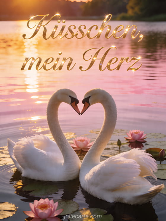 Teilen Sie eine liebevolle Küsschen-Botschaft mit dieser romantischen Karte aus zwei weißen Schwänen, die auf einem ruhigen See bei Sonnenuntergang ein Herz formen. Entdecken Sie auch kostenlose ai küsschen, liebesküsschen paar oder küsschen senden.