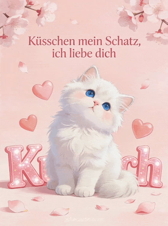 Küsschen mein Schatz, ich liebe dich eine süße Liebeskarte mit einem Perserkätzchen und Kirschblüten