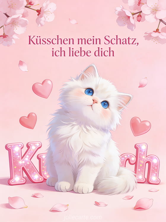 Sende süße Küsschen an deinen Schatz mit dieser entzückenden Karte mit einem weißen Perserkätzchen umgeben von rosa Herzen und Kirschblütenblättern. Entdecke auch eine wunderschöne Liebeskarte oder eine süße Liebeskarte.