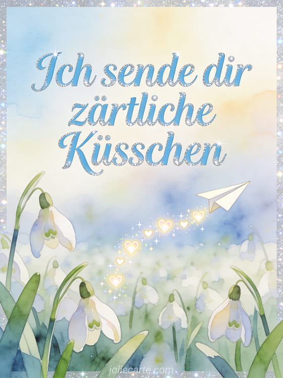 Sende zärtliche Küsschen mit einem kleinen Papierflieger, der leuchtende Herzen über eine Aquarellwiese mit Schneeglöckchen in klarem Licht trägt. Teile diese fröhliche Karte und entdecke auch Küsschenregen GIF, ich schicke dir ganz viele Küsse GIF oder zärtliche Küsse GIF.