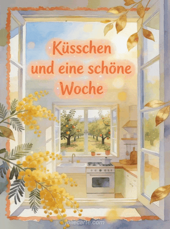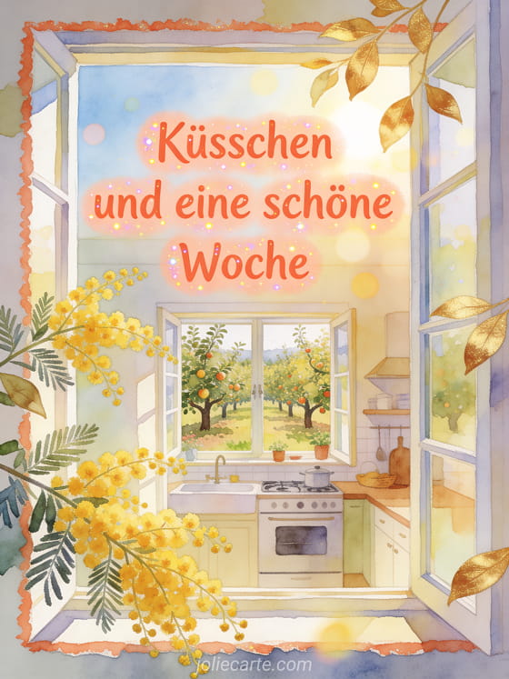 Teile einen frischen Wochengruß mit korallfarbener Schrift, goldenen Mimosenzweigen, einem gemütlichen Küchenfenster und einem sonnigen Obstgarten in sanftem Aquarelllicht. Dazu passen Küsschen zum Montag schöne Woche, dicke Küsse schöne Woche oder schöne Woche an alle Küsse.