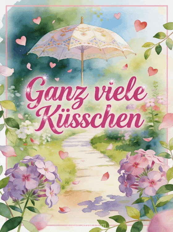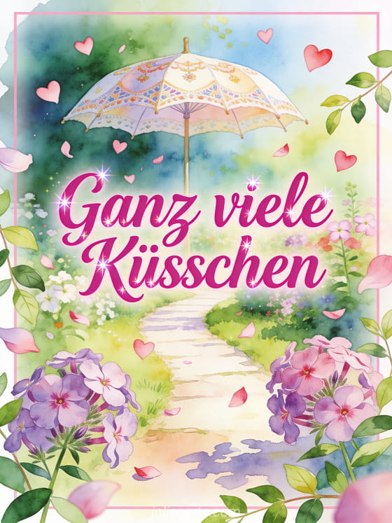 Sende ganz viele Küsschen mit einem Gartenweg unter einem dekorativen Regenschirm, herzförmigen Blütenblättern und hellen Phloxblüten. Entdecke auch ich schicke dir ganz viele Küsse GIF, Küsse senden GIF oder Affe Küsse GIF.