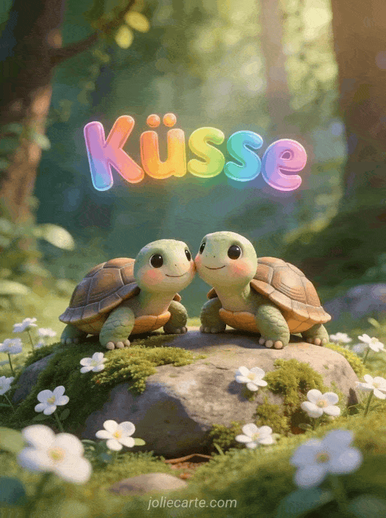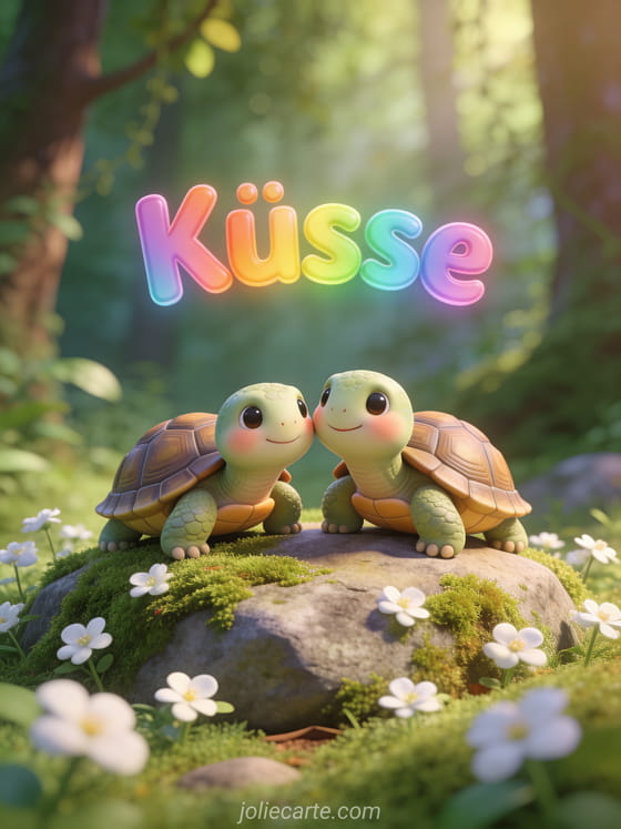 Sende süße Küsse mit dieser kostenlosen Clipart-Karte mit einem entzückenden Schildkrötenpärchen Seite an Seite auf einem bemoosten Stein im sanften Waldlicht. Entdecke auch eine Karte Küsse senden Bild oder eine Karte Küsse und Kaffee Bild.