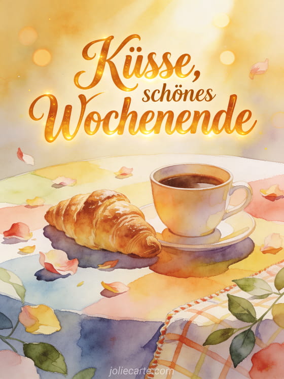 Teile einen gemütlichen Wochenendgruß mit honigleuchtender Schrift, einer warmen Kaffeetasse, einem Croissant, Blütenblättern und einem farbenfrohen Frühstückstisch. Entdecke auch Küsschen letztes Wochenende des Jahres, schönes Wochenende Küsse Bilder oder Küsschen schöne Bilder schönes Wochenende.