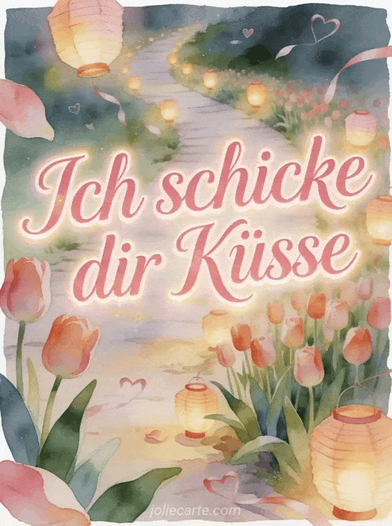 Sende einen zartlichen Küsse-Gruß mit luftiger rosafarbener Schrift und leuchtenden Rändern. Diese kostenlose Karte führt über einen Tulpenweg in Aquarell, gesäumt von leuchtenden Papierlaternen, schwebenden Herzbändern und warmem sanftem Licht. Entdecke auch ein Murmeltier Küsse gif, ein zärtliche Küsse GIF oder ein Schmetterlingsküsse GIF.