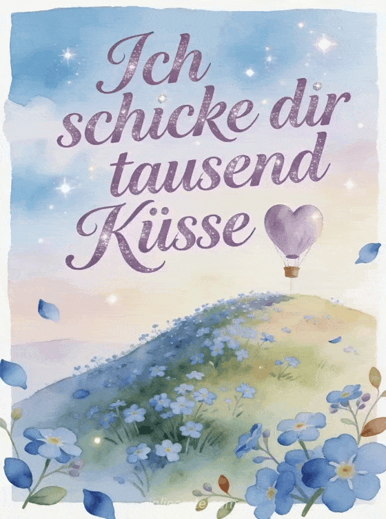Sende tausend liebevolle Küsse mit einem Hügel aus Vergissmeinnicht und einem herzförmigen Heißluftballon darüber. Entdecke auch Kussregen Bilder, Tierküsse Gif oder Küsschen Geschenk.