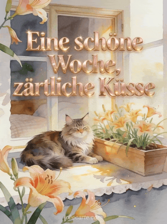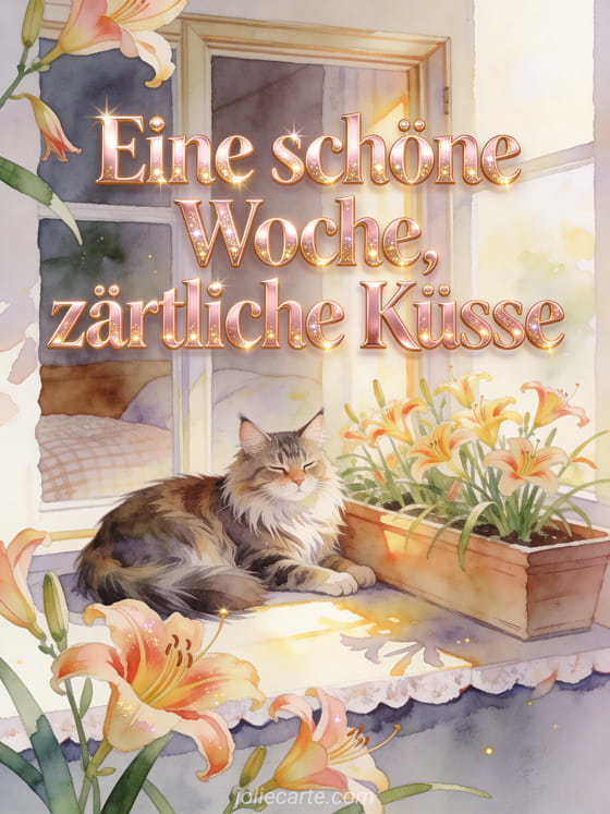 Wünsche eine schöne Woche mit roségoldener Schrift, einer Maine Coon Katze an einem sonnigen Fensterkasten und hellen Taglilien im warmen goldenen Licht. Entdecke auch eine schöne Woche euch allen Küsschen Bilder Karte, eine animierte GIFs schöne Woche Küsschen Karte oder eine hallo und schöne woche euch allen Karte.
