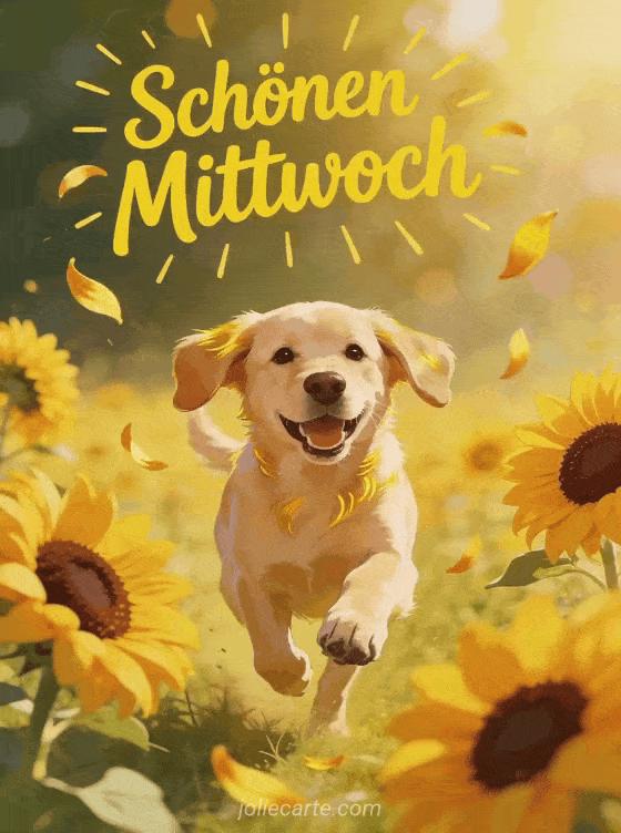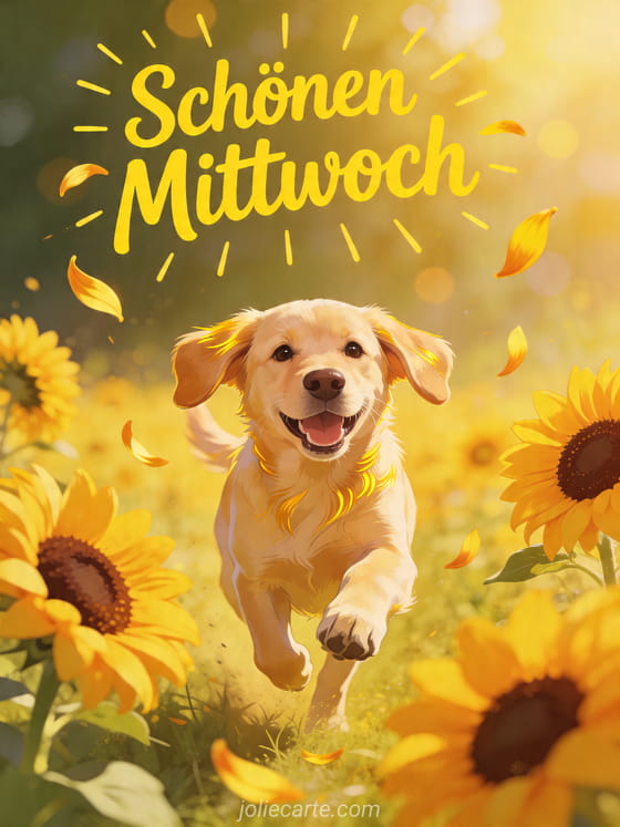 Teilen Sie einen schönen Mittwoch mit dieser sonnigen Karte mit einem lächelnden Labrador im Sonnenblumenfeld. Entdecken Sie auch bild regnerischer mittwoch, foto guten morgen schönen mittwoch oder schönen mittwoch und guten tag gif.