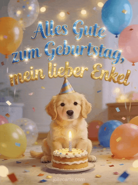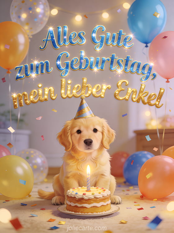 Senden Sie Ihrem lieben Enkel einen zarten Geburtstagsgruß mit einem niedlichen Golden-Retriever-Welpen im Partyhut, einer Torte mit Kerze, Ballons und Konfetti. Entdecken Sie auch Text zum Geburtstag für meinen Enkel, Geburtstagswünsche für meinen Enkel oder Geburtstag Enkel.