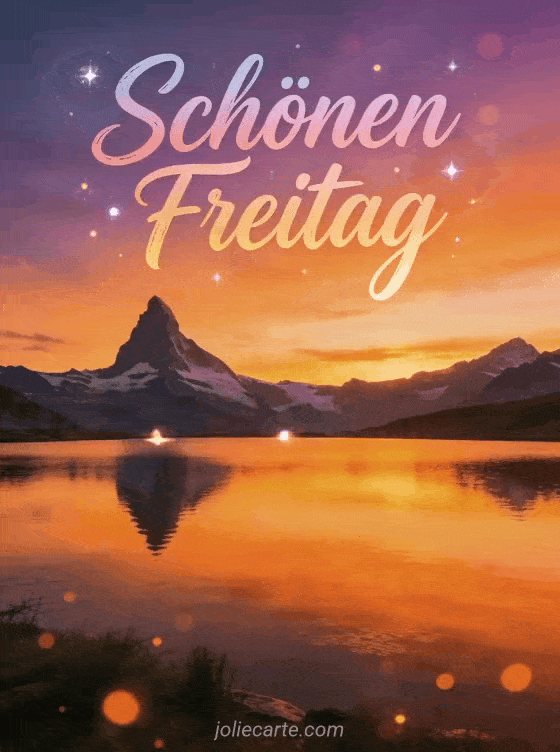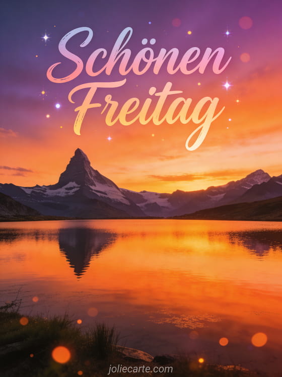 Teile einen eindrucksvollen Gruß zum schönen Freitag mit künstlerischer orange-violetter Kalligrafie, einer Bergsilhouette bei Sonnenuntergang und einem ruhigen See, der den orangefarbenen Himmel spiegelt. Entdecke auch eine animierte Karte zum schönen Freitag, ein GIF für schönen Freitag an alle oder eine lustige Humorkarte zum schönen Freitag.