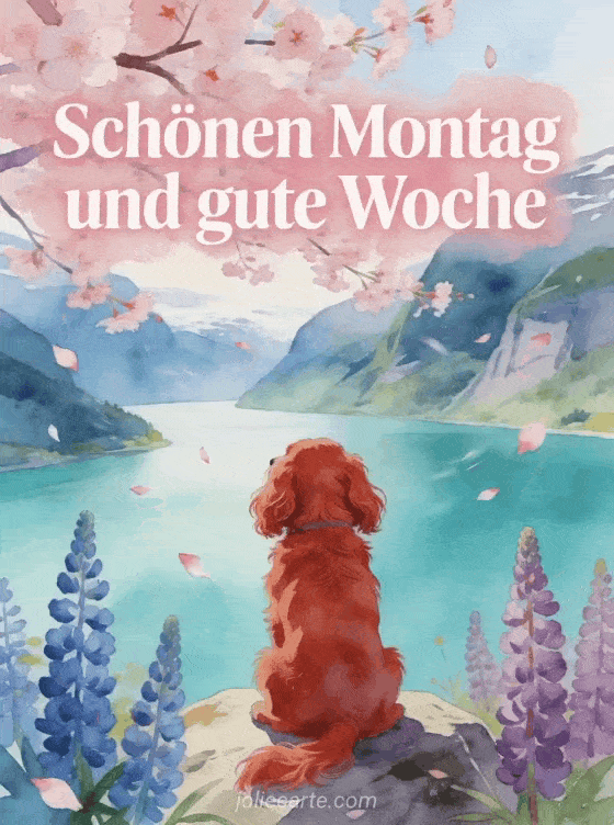 Senden Sie einen verträumten Gruß zum Montag und zur guten Woche mit dieser illustrierten Karte aus Kirschblüten, türkisfarbenem Fjord, Lupinen und einem English Cocker Spaniel. Entdecken Sie auch schönen montag und gute winterwoche, einen schönen montag und eine gute woche wünschen oder guten morgen schönen montag guten morgen gute woche.