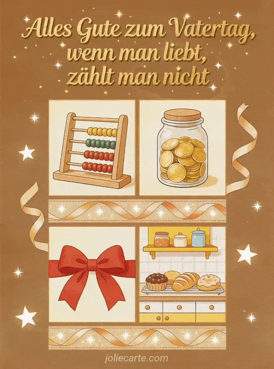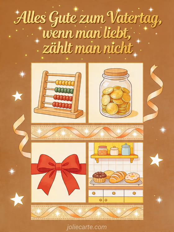 Feiere Papa mit einer warmen illustrierten Karte, die daran erinnert, dass Liebe nicht zählt, mit Holzabakus, goldenen Münzen, roter Geschenkschleife und süßem Gebäck. Das ist eine fröhliche Art, zum Vatertag Zuneigung zu teilen. Entdecke auch Alles Gute zum Vatertag, eine Grußkarte zum Vatertag oder ein Papa Vatertag Bild.