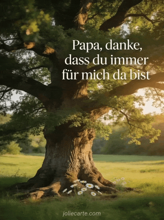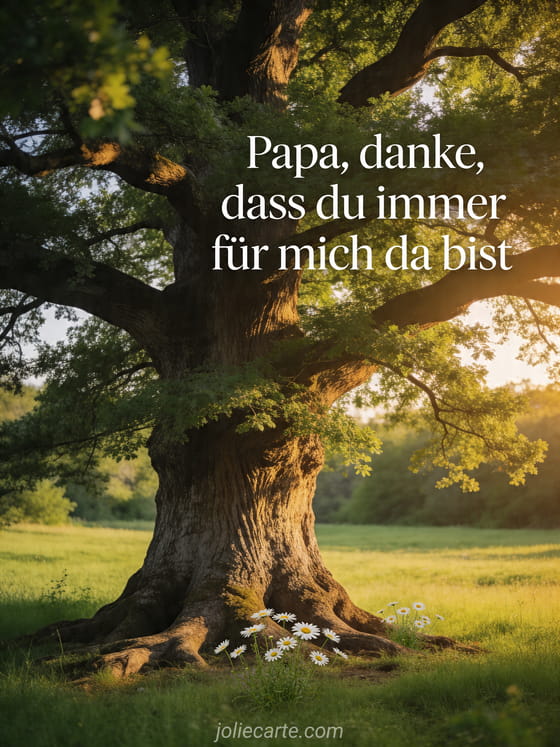 Teilen Sie liebe Worte zum Vatertag mit einem ruhigen Bild einer jahrhundertealten Eiche auf einer grünen Wiese, goldenem Abendlicht und Margeriten an ihren Wurzeln. Entdecken Sie auch ein kurzes Vatertagszitat, Alles Gute zum Vatertag Papa mein Schatz oder einen alles Gute zum Vatertag Papa berührender Text.