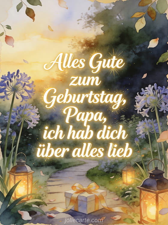 Teile ein Liebesgedicht für Papa zu seinem Geburtstag mit hohen Agapanthus rund um leuchtende Laternen und einem Geschenk mit Schleife auf einem Gartenweg. Dazu passen Geburtstagskarte für Papa, Gedicht Gedicht Papa alles Gute zum Geburtstag oder Geburtstagsgedicht Papa für Kind.