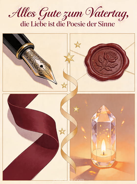 Teile eine stilvolle Vatertagskarte mit literarischer Stimmung, rubinroter Schrift, Kerzenlicht, Füllfederhalter, Wachssiegel, Schleife und Kristall. Sende eine liebevolle Botschaft voller Poesie und entdecke auch alles Gute Papa Mama, ein Vatertagsbild oder Guten Morgen Alles Gute zum Vatertag.