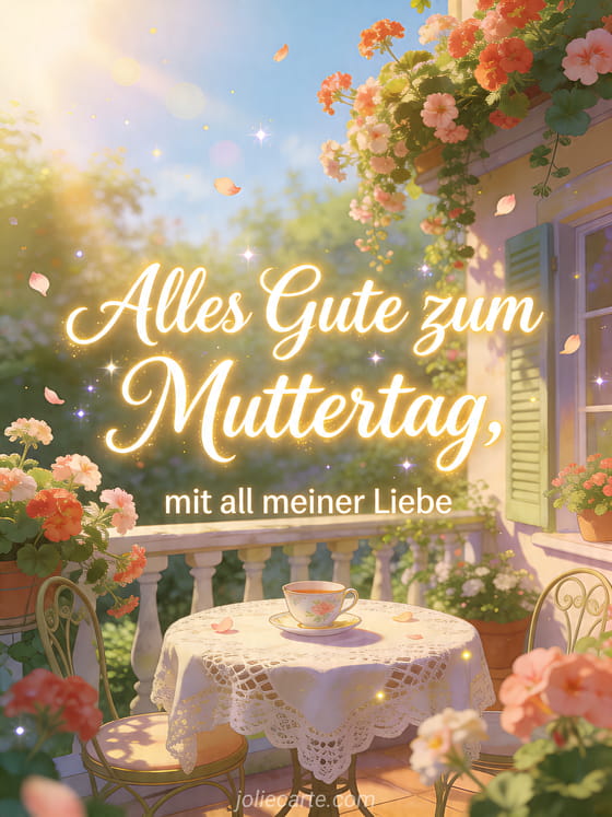 Teile eine fröhliche Muttertagskarte mit elfenbeinfarbener Kalligrafie, einer Bilderbuch-Gartenterrasse, hängenden Geranien, einem Spitzentisch und einer Porzellantasse im Sonnenaufgangslicht. Entdecke auch Liebesverse zum Muttertag, Alles Gute zum Muttertag und schönen Sonntag oder Zitate zum Muttertag.