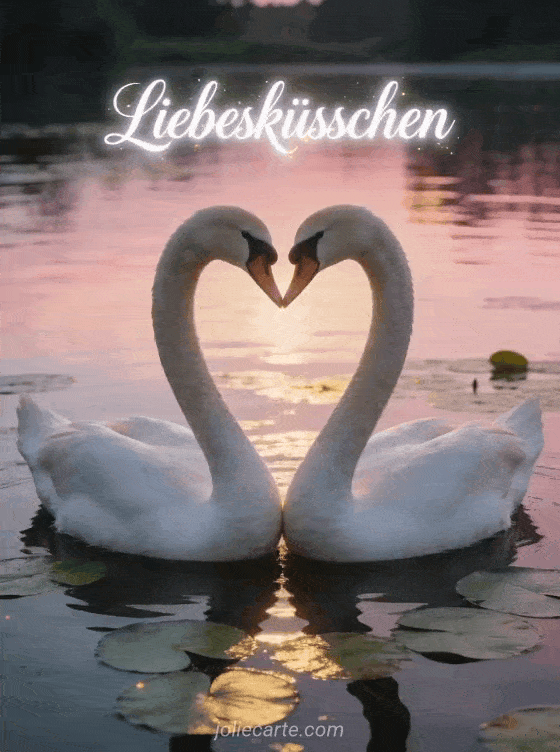 Teilen Sie eine romantische Liebesküsschen-Botschaft mit dieser eleganten Karte aus zwei Schwänen, die mit ihren Hälsen ein Herz auf einem leuchtenden See formen. Entdecken Sie auch küsschen bild, küsschen gif oder animierte küsschen logos.