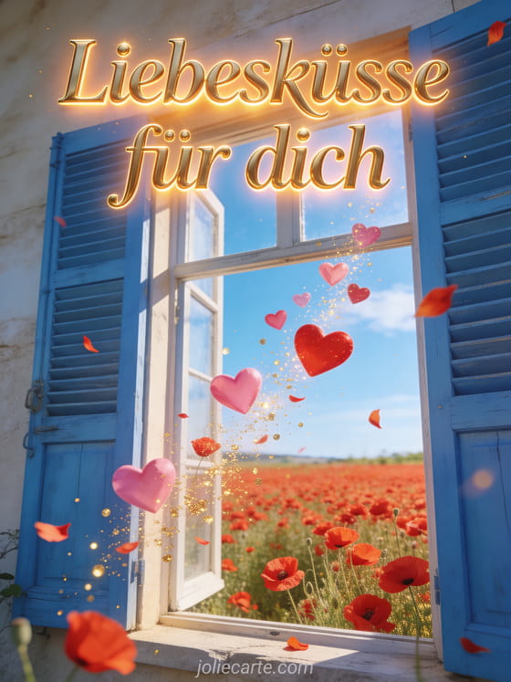 Sende diese romantische Karte mit dem Text Liebesküsse für dich in goldenen Buchstaben mit warmem Licht, mit einem offenen Fenster mit blauen Fensterläden und Blick auf ein Feld roter Mohnblumen im Sommer, mit rosa und roten Herzen, die zum Feld schweben. Entdecke auch eine Karte Verliebte guten Morgen Küsse oder eine Küsse von ganzem Herzen.