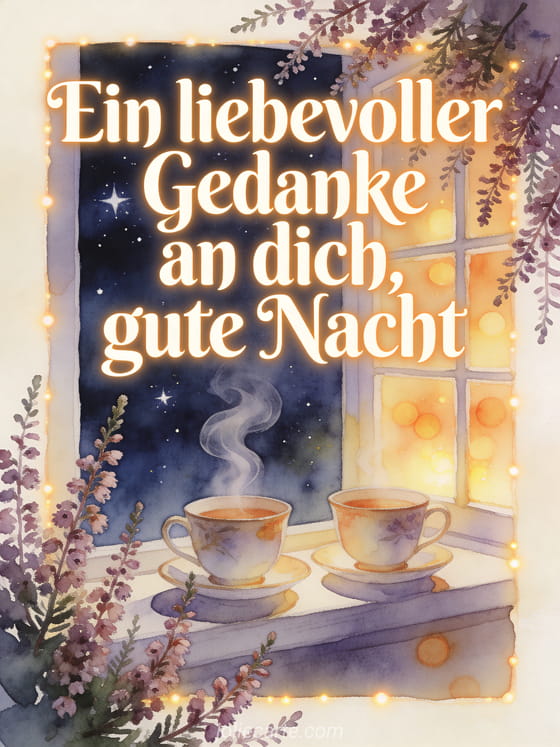 Teile einen liebevollen Gedanken und sage gute Nacht mit zwei passenden Teetassen, Heidekrautzweigen, einem leuchtenden Fenster und einer sternklaren Nacht. Entdecke auch eine Gute-Nacht-Nachricht für den Liebsten, eine gute Nacht virtuelle Karte oder eine süße Gute Nacht Nachricht.