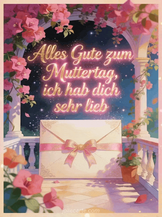 Teilen Sie einen zärtlichen Muttertagsgruß mit einem Briefumschlag mit Schleife, herabfallender Bougainvillea, festlichen Terrassenfarben und funkelndem Staub. Entdecken Sie auch ein Muttertagsgedicht, einen schöner Alles Gute zum Muttertag Spruch für eine Mama oder Lyrik zum Muttertag.