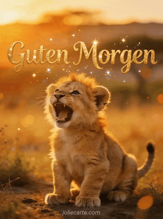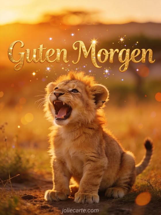 Eine kraftvolle und entzĂŒckende Guten Morgen Karte mit einem niedlichen Löwenjungen mit fluffiger MĂ€hne, das in der afrikanischen Savanne beim goldenen Sonnenaufgang gĂ€hnt. Entdecke auch eine zĂ€rtliche Guten Morgen Nachricht, eine Guten Morgen Nachricht oder ein animiertes Guten Morgen GIF.