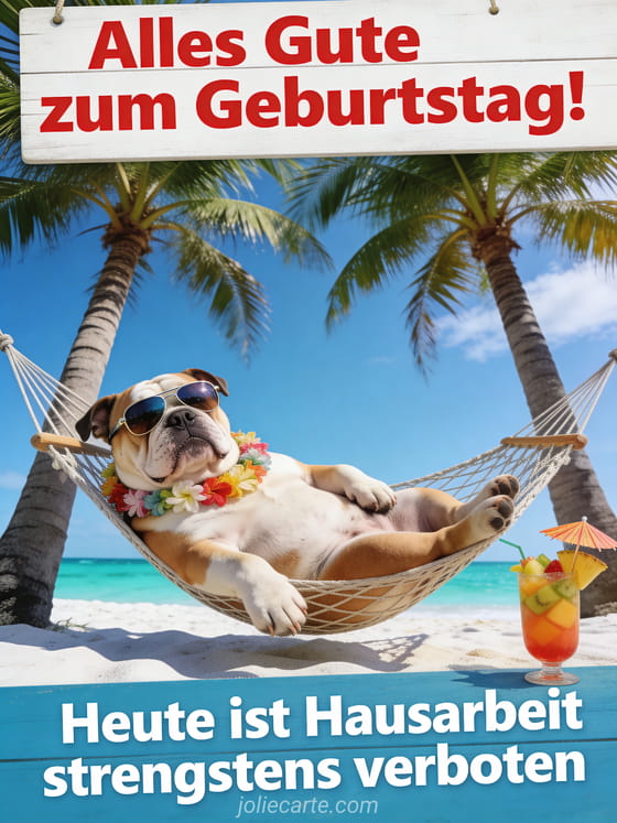 Diese Geburtstagskarte bringt sofort gute Laune: ein fotorealistischer Bulldog in der Hängematte, Palmen und sonnige Strandstimmung. Entdecke auch Geburtstag Katze Humor, witziges geburtstagsvideo und alles Gute zum Geburtstag animiertes GIF Humor.