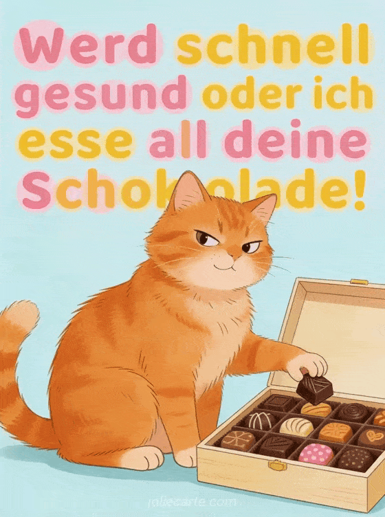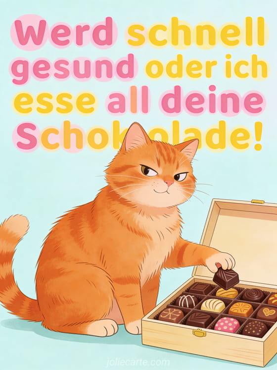 Zaubern Sie jemandem ein Lächeln ins Gesicht mit dieser lustigen Genesungskarte. Ein freches Kätzchen droht, die ganze Schokolade aufzuessen, wenn die Genesung nicht schnell genug kommt.
