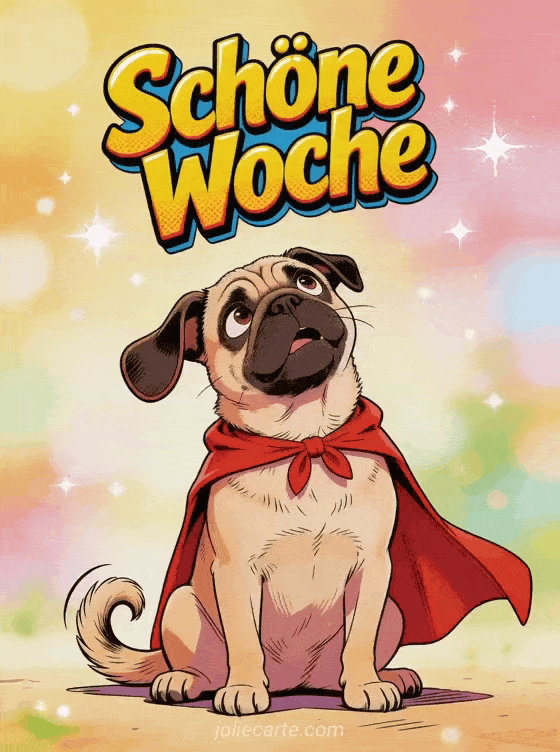 Schöne Woche ein lustiger Wochenwunsch mit einem Mops als Superheld