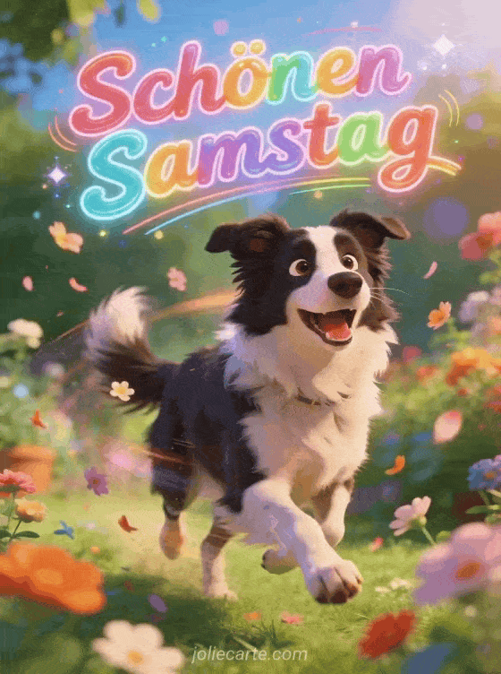 Teile mit dieser kostenlosen Karte einen fröhlichen Gruß für einen schönen Samstag mit einem Border-Collie-Hund, der voller Freude durch einen blühenden Garten flitzt. Entdecke auch bild wunderschönen samstag, humorvoller schöner samstag humor oder guten morgen und schönen samstag.