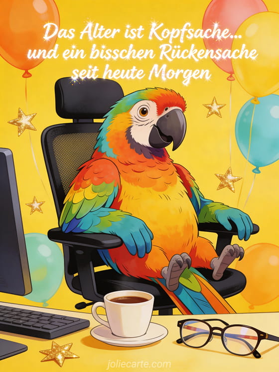 Sende diese witzige Geburtstagskarte mit einem bunten Papagei im Bürostuhl mit Kaffeetasse und Lesebrille. Entdecke auch eine lustige Otter-Geburtstagskarte oder eine glamouröse Katzen-Geburtstagskarte.