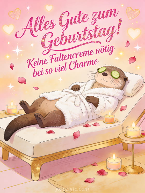 Sende diese witzige Geburtstagskarte mit einem süßen Otter im Spa-Bademantel mit Gurkenscheiben auf den Augen. Entdecke auch eine lustige Katzen-Geburtstagskarte oder eine Geburtstagskarte mit Humor für Frauen.