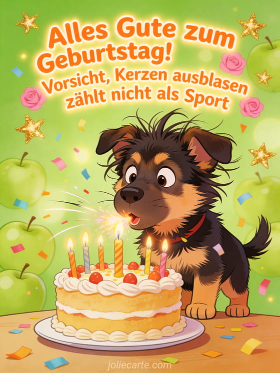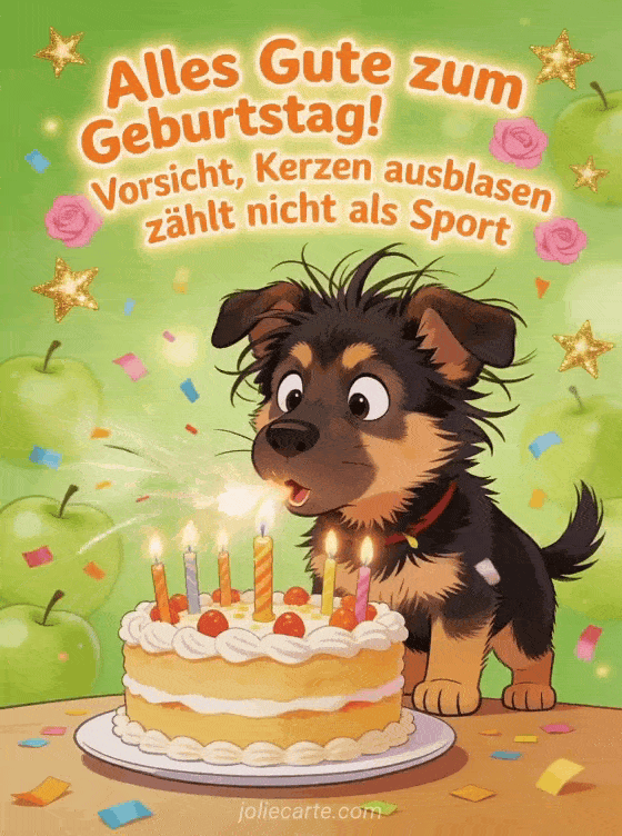 Sorge fĂŒr gute Laune mit dieser lustigen Geburtstagsnachricht Kind, bei der ein wuscheliger SchĂ€ferhund-Welpe hartnĂ€ckige Kuchenkerzen auspusten will und ĂŒberall Konfetti fliegt. Entdecke auch Bild Geburtstagskarte Kind, Video Alles Gute zum Geburtstag Baby und Geburtstagskarte Kind Feier.